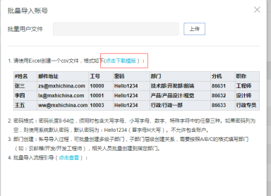 注意:1.模板表格中姓名,密碼和郵箱地址為必填項,其它單元格可以留空,但不可以刪除或修改表頭。